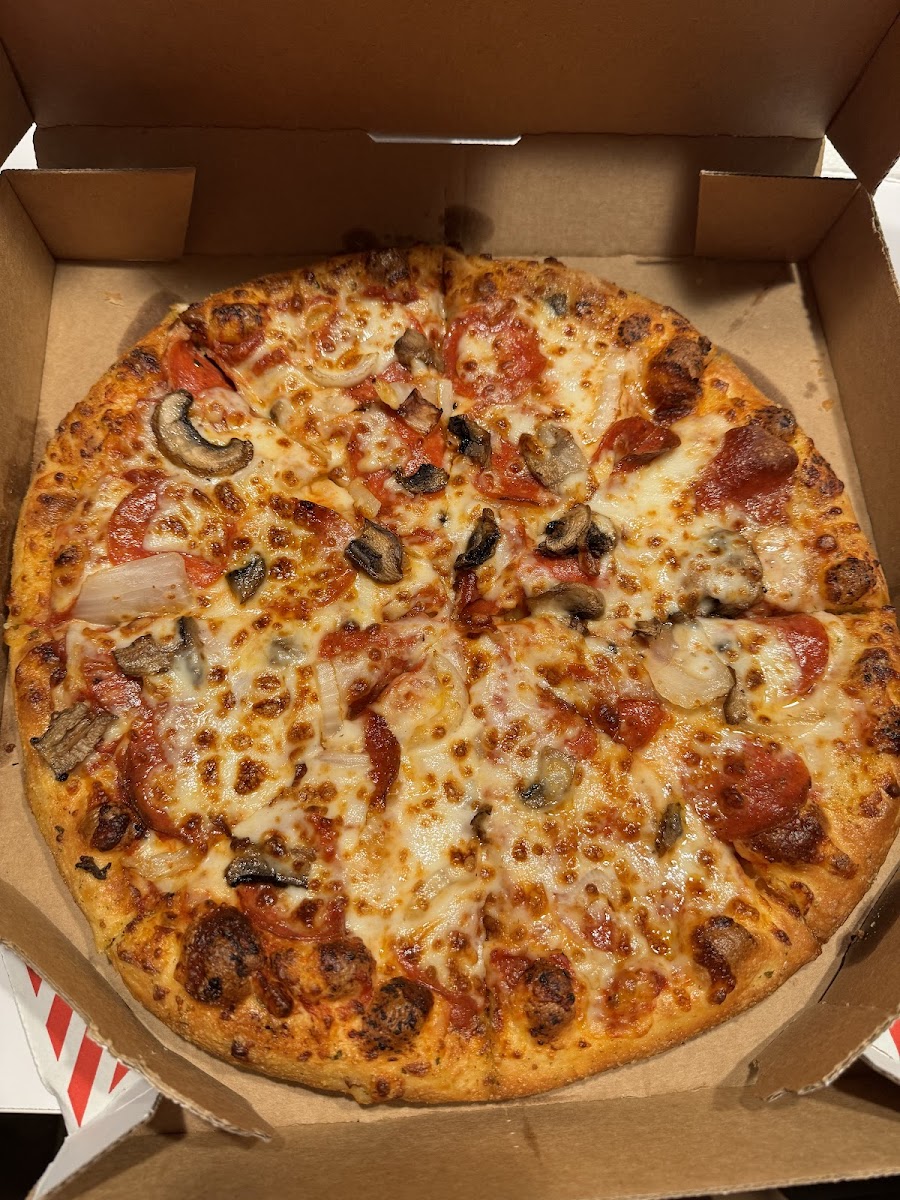 Great spot for pizza. While dominos recipe has never been my favorite this is a relibable pizza place that has great staff and has never been late with an order. I always choose them over others because they actually have a gluten free option you can easily order online (unlike many other local pizza places) They take good care of me and have always been able to help with requests such as Tax exemption. Overall a good choice and crowd favorite.